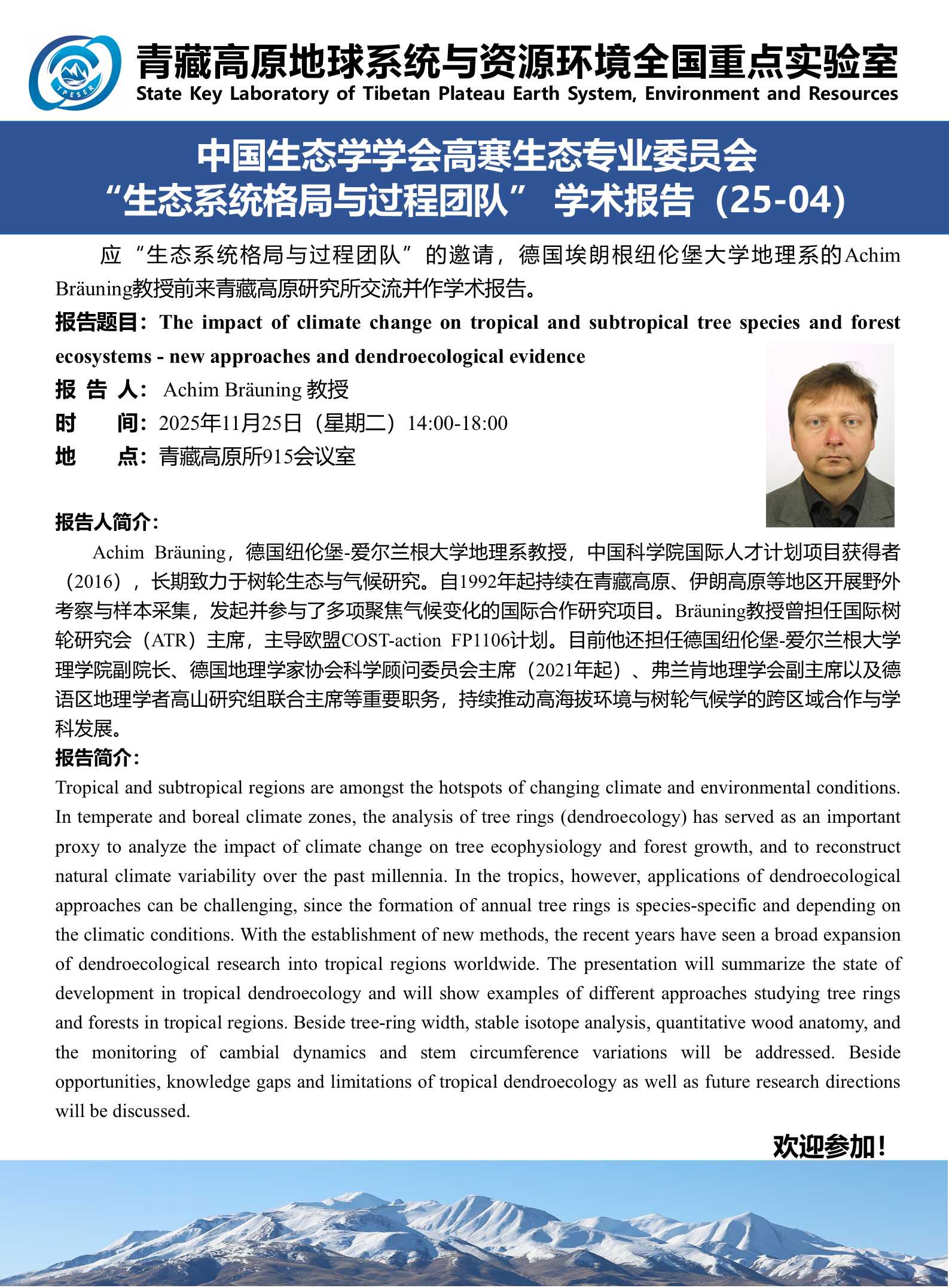 报告题目:The impact of climate change on tropical and subtropical tree species and forest ecosystems - new approaches and dendroecological evidence