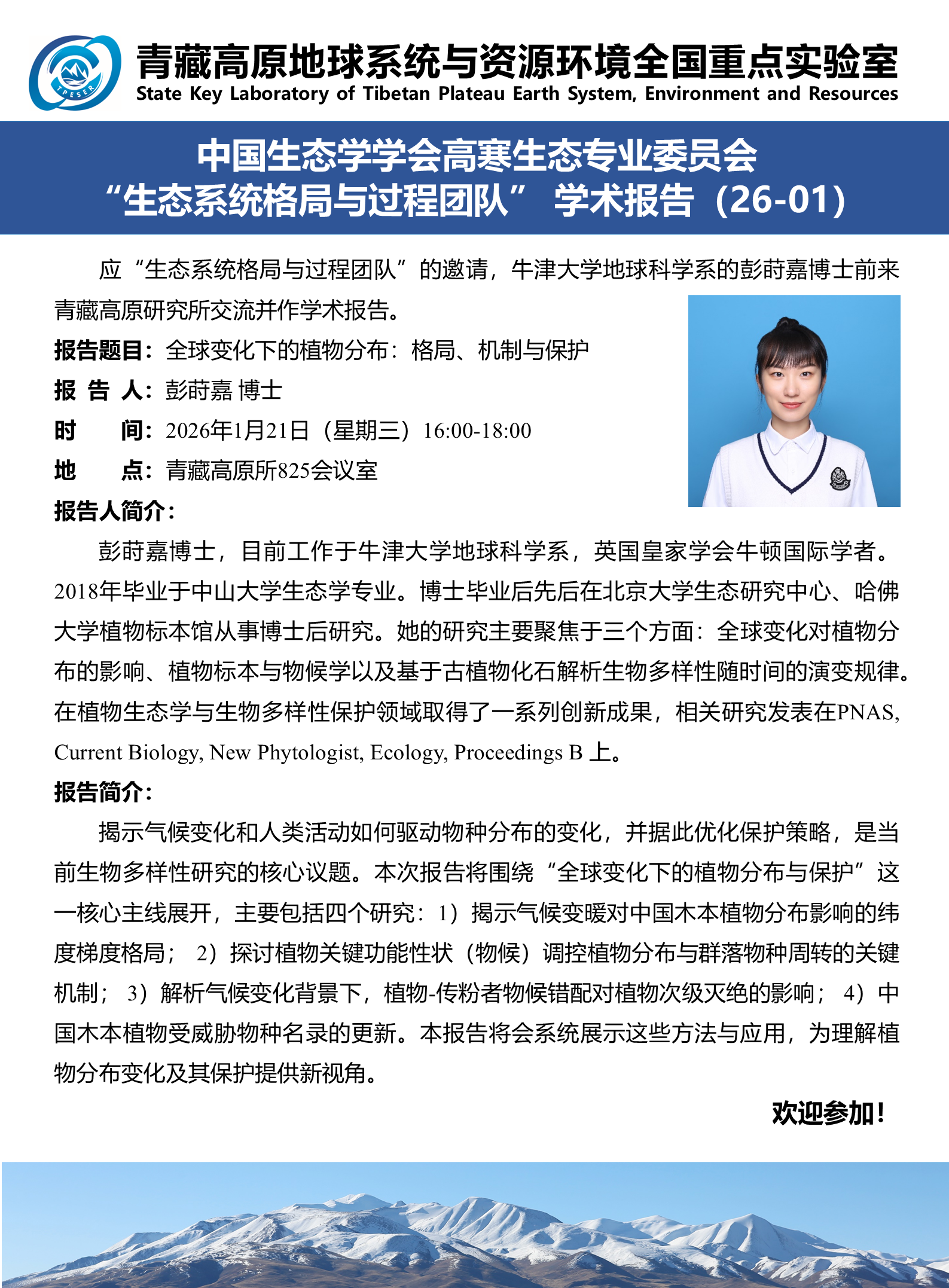 报告题目:全球变化下的植物分布:格局、机制与保护