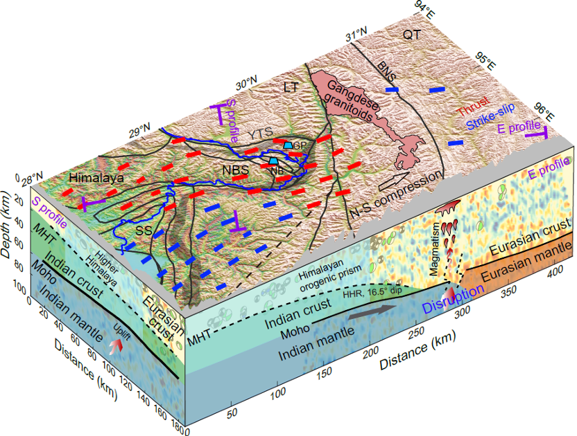 喜马拉雅山脉是地球上典型的活动碰撞造山带,为阐明该造山带的演化过程,学者们提出了多种模型,其中俯冲印度板块的几何形态被视为约束这些模型的重要因素。过去研究多集中于山脉中段,认为那里存在一条名为“主喜马拉雅逆冲断裂”的巨型逆冲构造,是大地震和山脉隆升的主因,而喜马拉雅东部尚未明确识别到类似中部的大型逆冲结构。