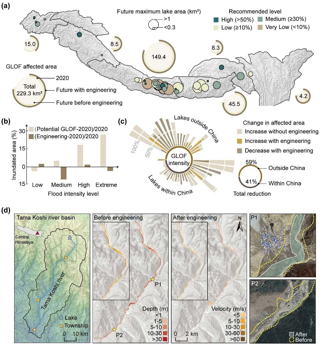 研究结果显示,尽管1990—2023年间喜马拉雅地区的GLOF发生频率未呈显著上升趋势,但由于下游暴露度和脆弱性的增加,灾害损失正在加剧(图1)。随着冰湖的持续扩张,预估现有冰碛湖最大总面积将达到约378 km²,为2020年的1.9倍,体积增加约8.7 km³(图2)。若不采取干预措施,未来GLOF的洪水强度预计上升超过27%,其中中国境内增加约21%,而境外增加约40%(图2)。若对所有高危冰湖实施中国冰湖管理实践措施,可将喜马拉雅未来GLOF洪水强度降低约24%,其中中国境外降幅可达29%(图3)。