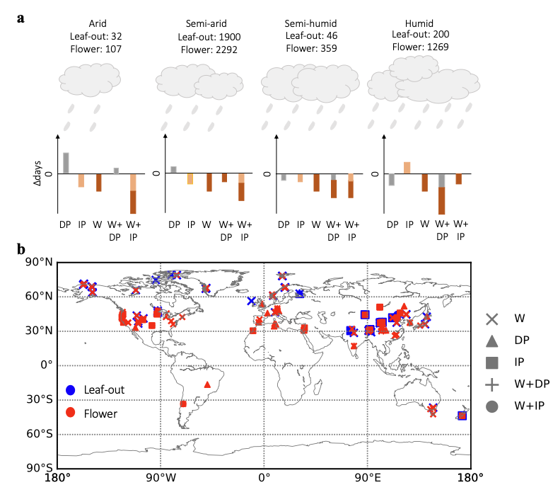 植物物候(如返青期和开花期)是生态系统响应气候变化的重要指标。随着全球气候变暖,植物春季物候普遍提前,但增温也可能引发土壤干旱等,从而推迟物候。尽管已有大量研究探讨了增温和降水变化及其互作效应对植物物候的影响,但目前尚未有一致的结论,特别是发现温度与降水变化对植物物候的影响存在协同、拮抗和没有互作效应。所以,我们假设这些差异可能源于不同试验地点的环境气候条件不同,尤其是干旱程度的差异(图1a)。特别是不同植物功能群植物(如禾草、莎草、杂类草和豆科植物)的抗旱性或耐旱性不同,它们对气候变化的响应也可能不同,进而导致不同植物物候对温度与降水变化及其互作效应表现出不同的响应模式。