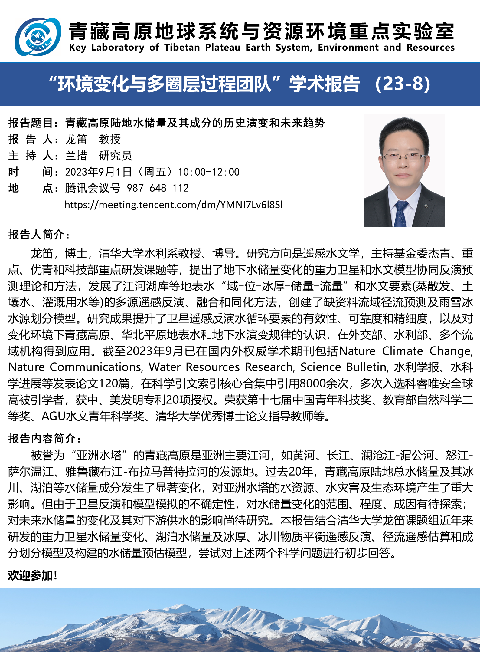 报告题目:青藏高原陆地水储量及其成分的历史演变和未来趋势