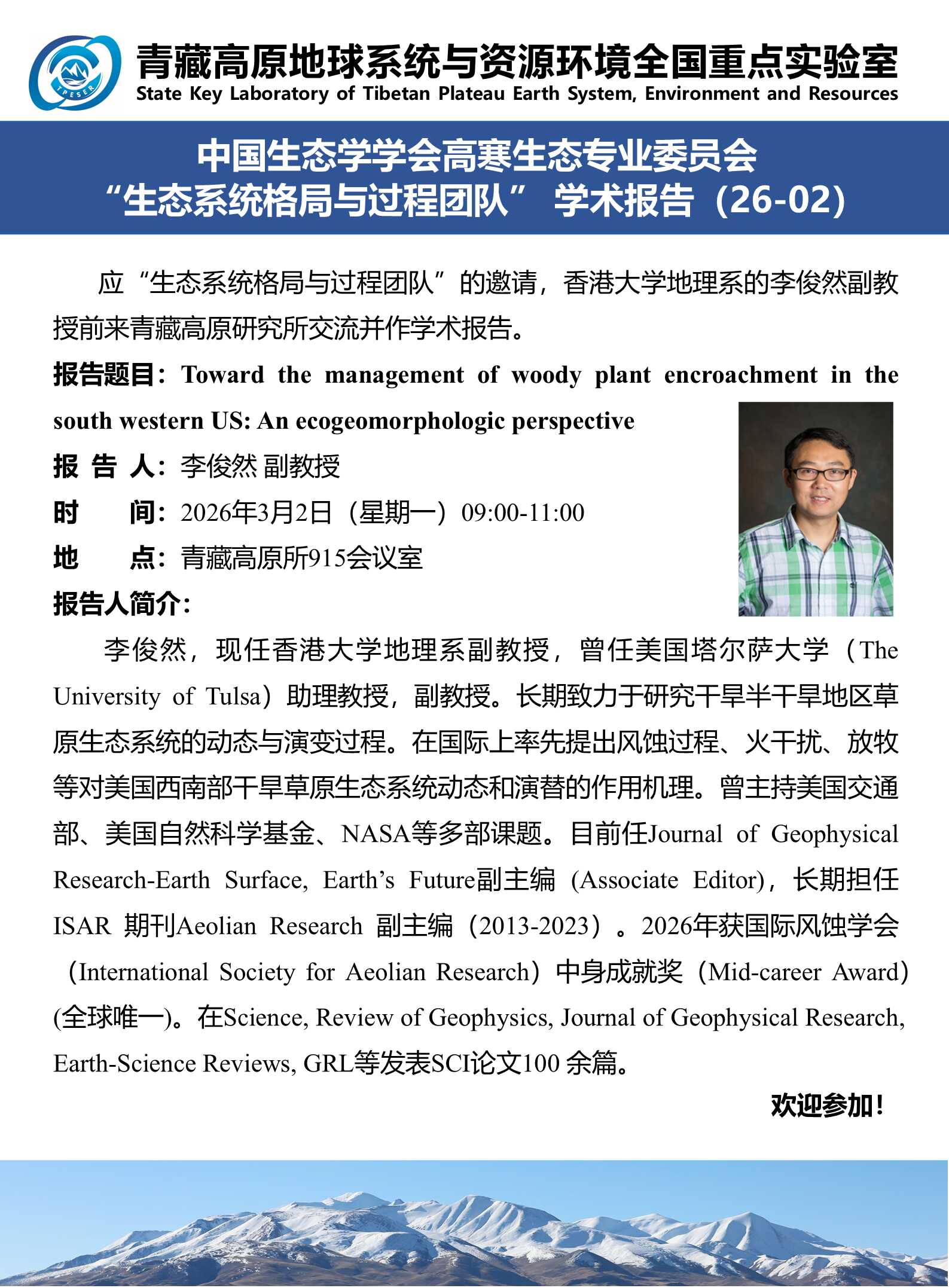 报告题目:Toward the management of woody plant encroachment in the south western US: An ecogeomorphologic perspective