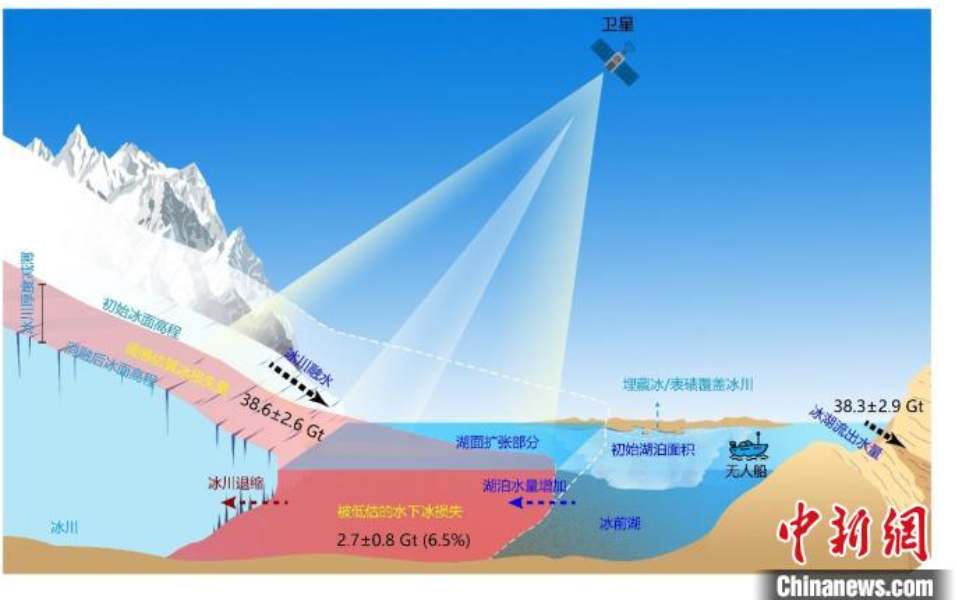 论文第一作者和共同通讯作者张国庆研究员介绍说,数字高程模型(DEM)广泛用于估算全球冰川质量损失,但该方法只能观测到冰川表面和水面,不能揭示发生在冰前湖泊水面以下的冰川质量损失。