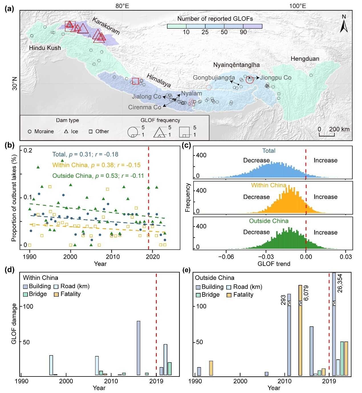 图1.喜马拉雅地区历史GLOF事件分布、频率与灾害损失
