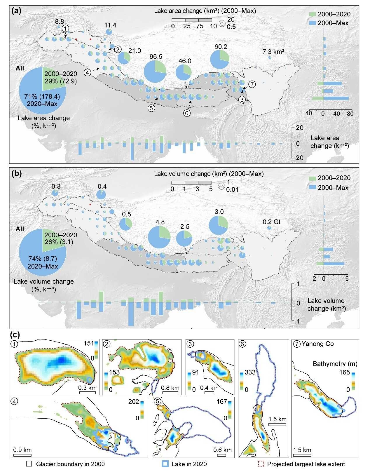 图2.喜马拉雅地区冰碛湖未来面积与体积演变预估