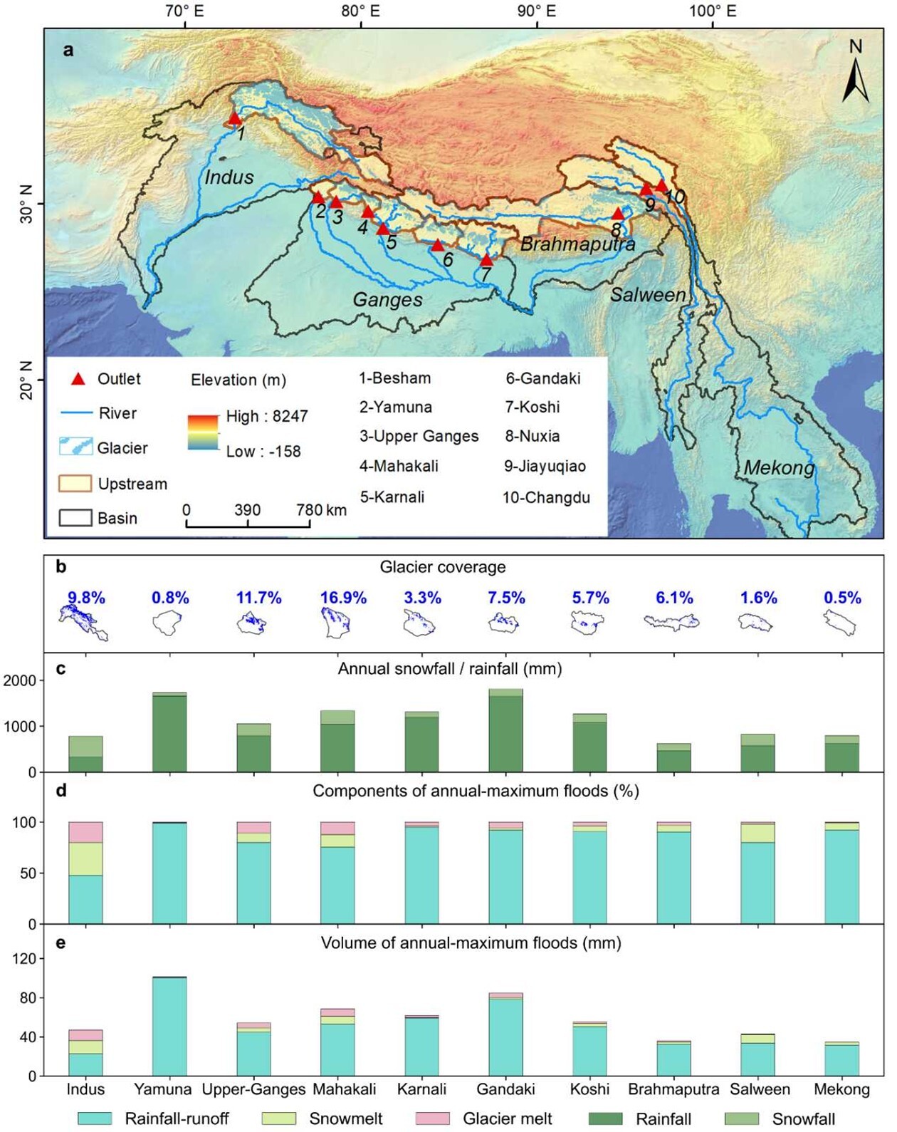 图1. 青藏高原南部跨境外流河年最大河流洪水组分的平均贡献。a:研究区概况;b:各流域冰川覆盖比;c:各流域平均年降雪/降雨量;d:融冰、融雪和降雨对年最大河流洪水的平均贡献比;e:融冰、融雪和降雨对年最大河流洪水的平均贡献水量